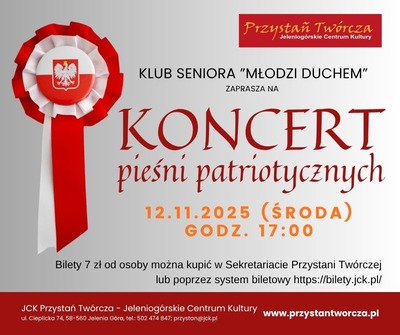 Zapraszamy na koncert pieśni patriotycznych, podczas którego wspólnie zaśpiewamy hymn narodowy oraz utwory pełne dumy i historii, takie jak "Przybyli Ułani pod okienko". Występ wykona wspaniały Duet Cantante, czyli Alicja i Jacek Nahotko. W programie usłyszycie znane pieśni, które od pokoleń wzmacniają naszą tożsamość i patriotyzm. To wyjątkowa okazja, by razem uczcić ojczyznę i przypomnieć sobie wartości, które nas łączą.
