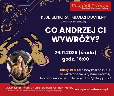 Zapraszamy na wyjątkową andrzejkową zabawę pod hasłem "Co Andrzej Ci wywróży?", która przeniesie uczestników w świat tajemniczych wróżb, magii i radosnej muzyki.  Nie zabraknie również naszego ulubionego DJ POWERA, który porwie nas na parkiet. Czekają na Państwa miła atmosfera, drobny poczęstunek i ciekawe wróżby. Zapraszamy!